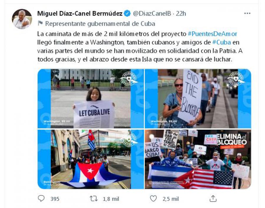 Le président de Cuba, Miguel Diaz-Canel, a remercié aujourd’hui la solidarité des protagonistes de la marche de plus de deux mille kilomètres du projet Puentes de Amor (Ponts d’Amours) vers la capitale nord-américaine de Washington.