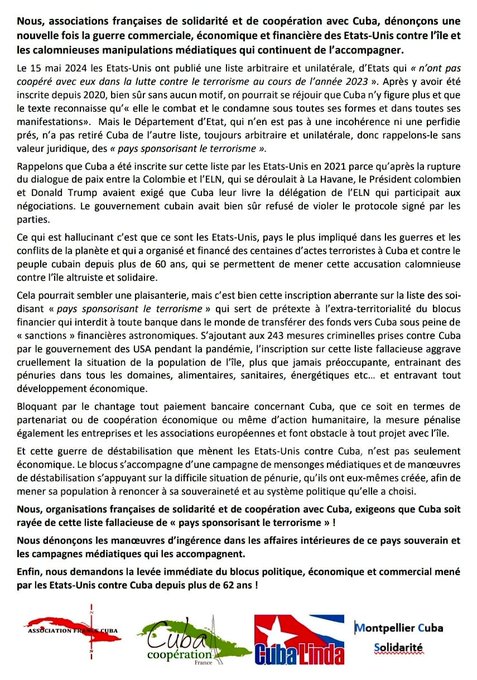 Déclaration des organisations Cuba Coopération France (CubaCoop), France Cuba, Cuba Linda et Montpellier Cuba Solidarité demandant conjointement aux Etats-Unis de retirer Cuba de leur liste unilatérale de pays soutenant le terrorisme, accusation qu'ils qualifient de fallacieuse et condamnent ce mécanisme de Washington sans aucun aval de la communauté internationale.
