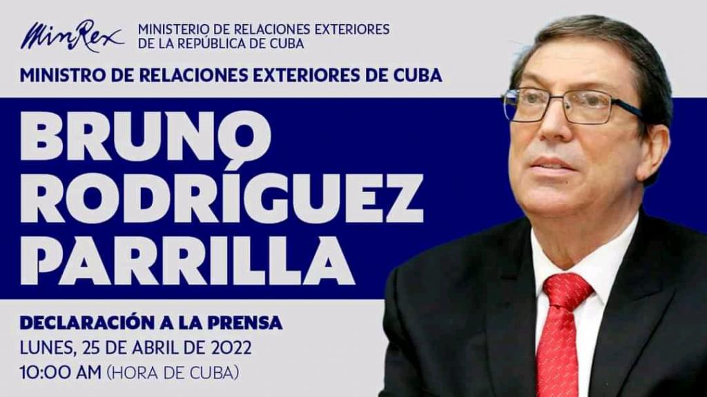 #Cuba aujourd'hui 25 avril, 10h00, importante déclaration à la presse de notre ministre des Affaires étrangères @BrunoRguezP Retransmission en direct sur Cubavisión Internacional, Radio Rebelde, Canal Caribe et en streaming sur @CubaMINREX