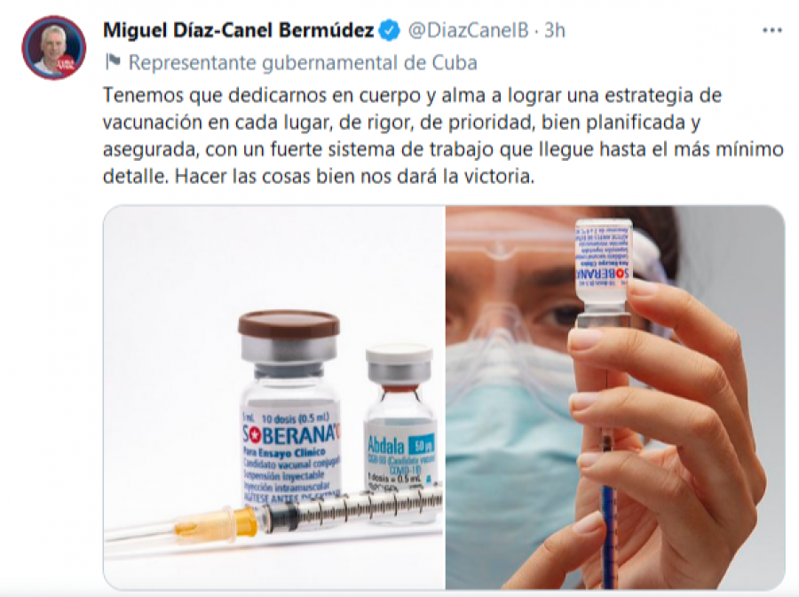 «Il semble parfois que nous n'avançons pas, que l'horizon est trop lointain. Un an et plus de pandémie et les chiffres de la contagion, élevés pour Cuba, nous inquiètent, mais nous occupent aussi. Le défi nous motive», a ajouté le président sur Twitter.