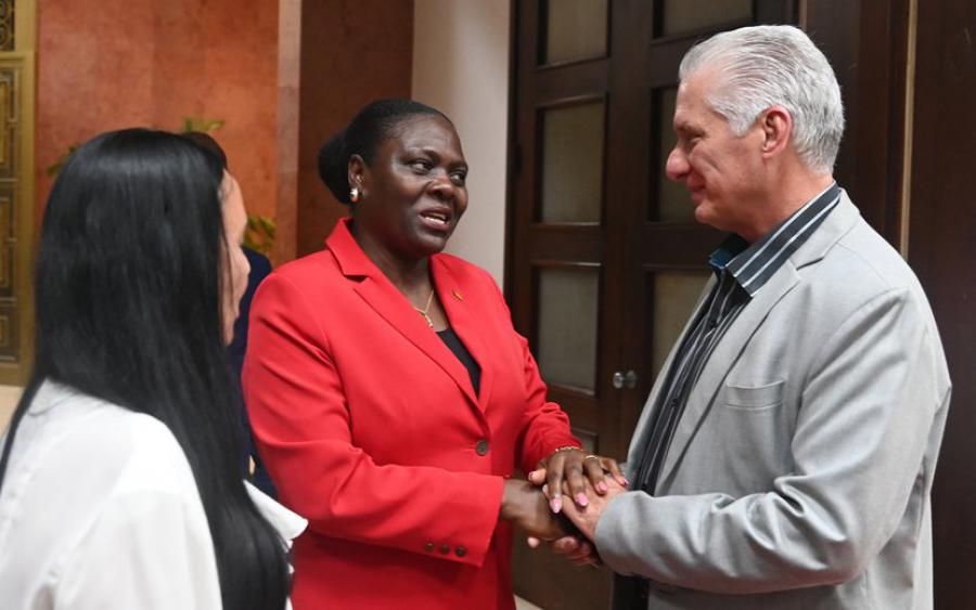 La Havane, le 22 septembre 2025. - Le président de la République de Cuba, Miguel Díaz-Canel Bermúdez, a reçu lundi après-midi, au Palais de la Révolution, Son Excellence Madame Celmira de Almeida do Sacramento dos Santos Lourenco, présidente de l'Assemblée nationale de la République démocratique de Sao Tomé-et-Principe.