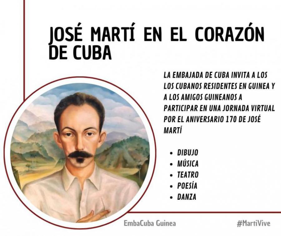 A partir de ce jour, notre Mission diplomatique appelle à une journée virtuelle pour le 170ème anniversaire de la naissance du héros cubain, à laquelle pourront participer les Cubains vivant en Guinée et les amis guinéens. Ils peuvent participer par des dessins, des discours, de la musique et d'autres expressions artistiques.