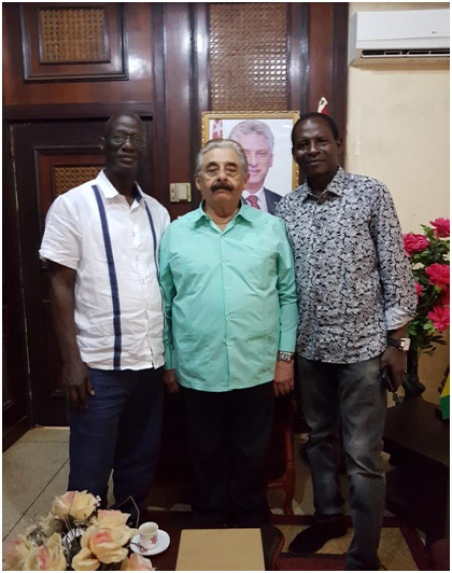 L'Ambassadeur de la République de Cuba à Conakry, Roberto Rodriguez Peña, a reçu le conseiller de l'Ambassade de la République de Guinée à La Havane, accompagné de M. Ibrahim Bah. Au cours de la réunion ont été abordées différentes questions d'intérêt bilatéral, notamment la coopération médicale entre les deux pays, parmi d'autres questions en attente.