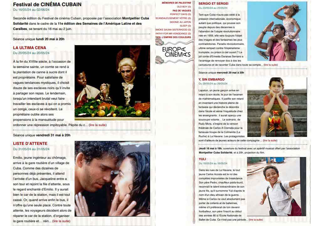 Paris, Apr 29 (Prensa Latina) Les semaines latino-américaines dans la région Occitanie, dans le sud de la France, incluront une nouvelle édition du Festival du cinéma cubain en mai et juin, a déclaré aujourd'hui l'organisateur, l'association Montpellier Cuba Solidarité.
