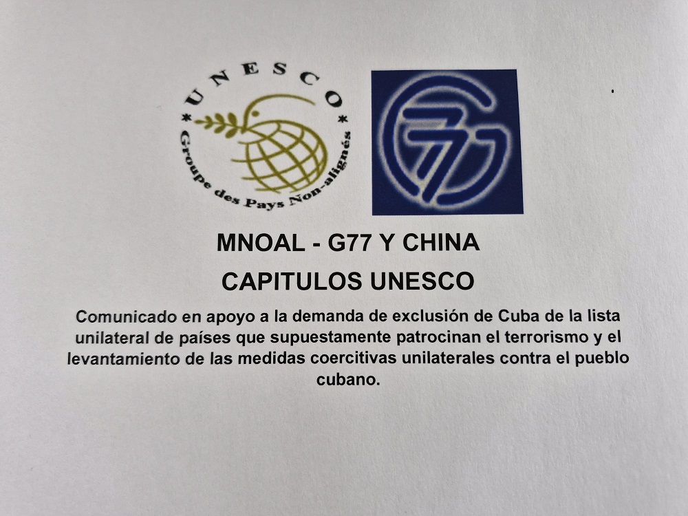 “Le Groupe du 77 et la Chine et le Mouvement des pays non alignés chapitres Paris/UNESCO expriment sa profonde préoccupation quant à l’impact négatif de la permanence injuste de Cuba sur la liste des pays qui parraineraient le terrorisme, ce qui aggrave les effets du blocus économique, commercial et financier imposé au pays depuis plus de 60 ans, Il s’agit d’une initiative qui touche tous les secteurs de la vie du pays, en particulier les domaines de l’éducation, de la science, de la communication, de l’information et de la culture, ainsi que la mise en œuvre de programmes de coopération dans ces domaines”.