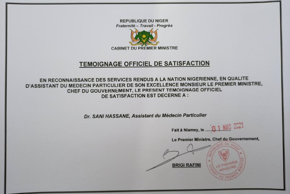 Niamey, 6 avril. Le Premier Ministre sortant de la République du Niger, S. Brigi Rafini a délivré un certificat officiel de satisfaction pour les services rendus à plusieurs membres de son équipe personnelle.