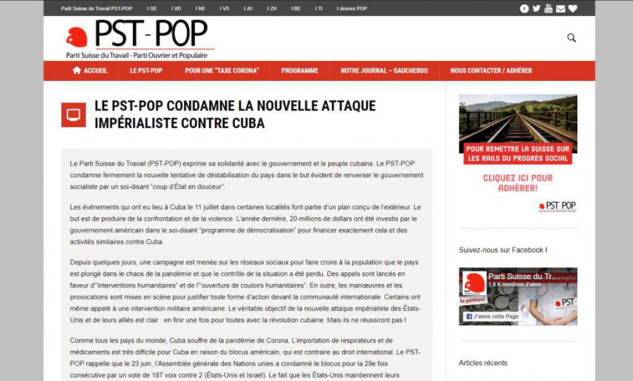 Le Parti Suisse du Travail (PST-POP) exprime sa solidarité avec le gouvernement et le peuple cubains. Le PST-POP condamne fermement la nouvelle tentative de déstabilisation du pays dans le but évident de renverser le gouvernement socialiste par un soi-disant “coup d’État en douceur”.