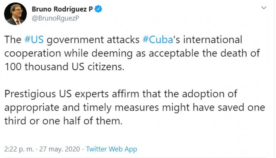 La Havane, 27 mai , 2020.- Le ministre des Affaires Étrangères de Cuba, Bruno Rodriguez, a déclaré aujourd’hui que le gouvernement des États-Unis devrait s’occuper de l’impact du Covid-19 sur ses citoyens plutôt que d’attaquer la coopération médicale de l’île.