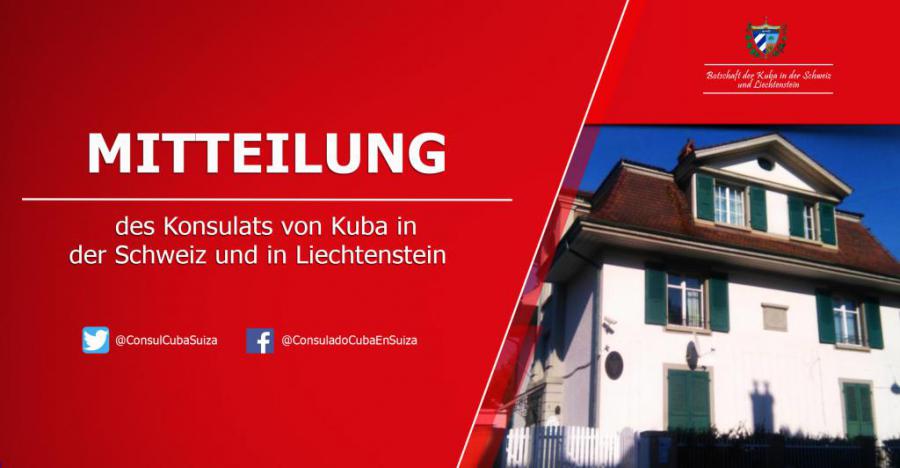 Auf Grund dessen, dass die Situation in der Schweiz wegen der schnellen Ausweitung der Covid-19-Pandemie vom Schweizerischen Bundesrat neu als «außerordentliche Lage» gemäß dem Epidemien-Gesetz eingestuft wurde; hat die Botschaft der Republik Kuba in der Schweiz entschlossen, bis auf Weiteres nur dringende Dienstleistungen vom Konsulat der Republik Kuba in Bern mit Anwesenheit der betreffenden Person anzubieten.