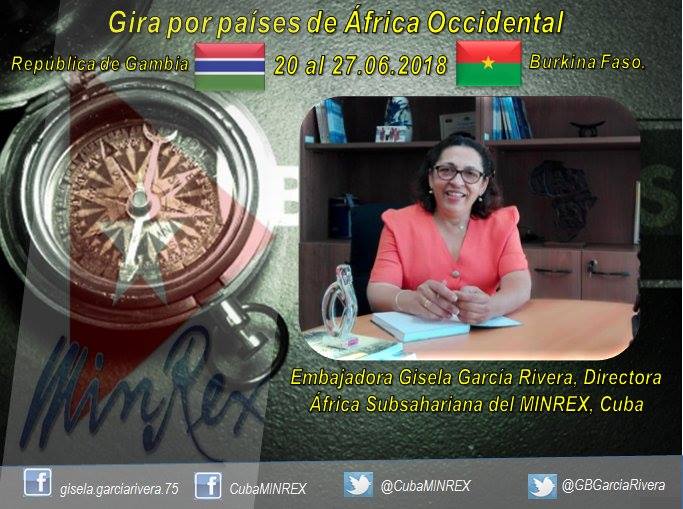 L'Ambassade de la République de #Cuba au Burkina Faso annonce la visite de la Directrice de l'Afrique Subsaharienne de #CubaMinrex a la Gambie et la "terre des hommes intègres" -Bukina Faso- du 20 au 27 juin 2018.