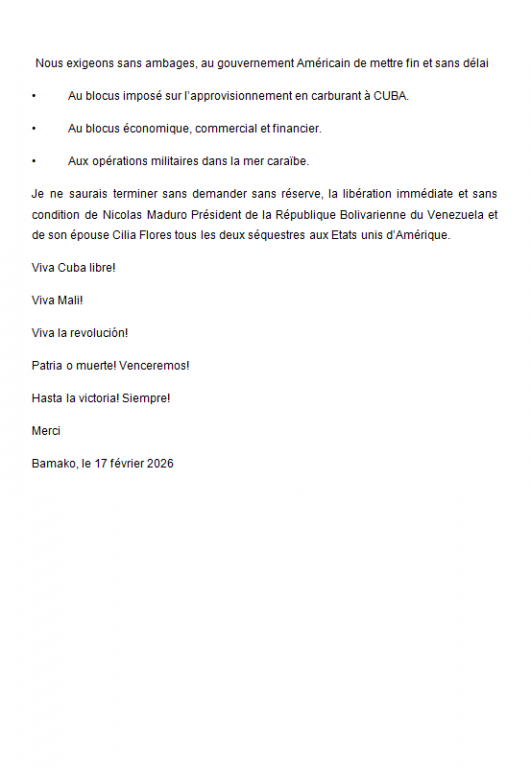 De nombreuses organisations de la société civile malienne se sont réunies le 17 février à l'ambassade de Cuba à Bamako pour exprimer leur solidarité avec le peuple cubain en cette heure cruciale de résistance face à la furieuse offensive de l'impérialisme, qui menace aujourd'hui non seulement la paix à Cuba et en Amérique latine, mais aussi la paix dans le monde.