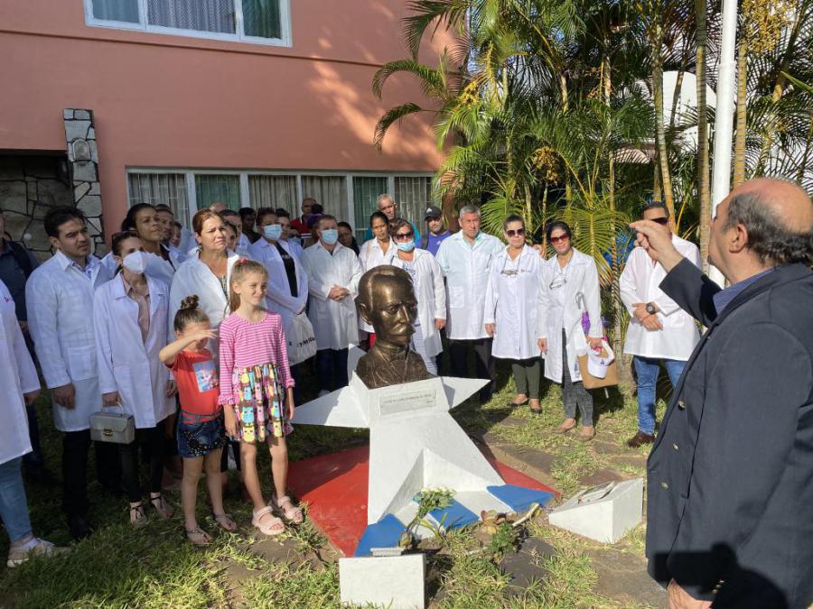 As palavras centrais foram pronunciadas pelo Cônsul. Depois, foram depositadas flores brancas no busto e feitas as fotos de familia com todos os presentes. Assim começavam, um día antes, as actividades em homenagem ao mais universal de todos os cubanos.