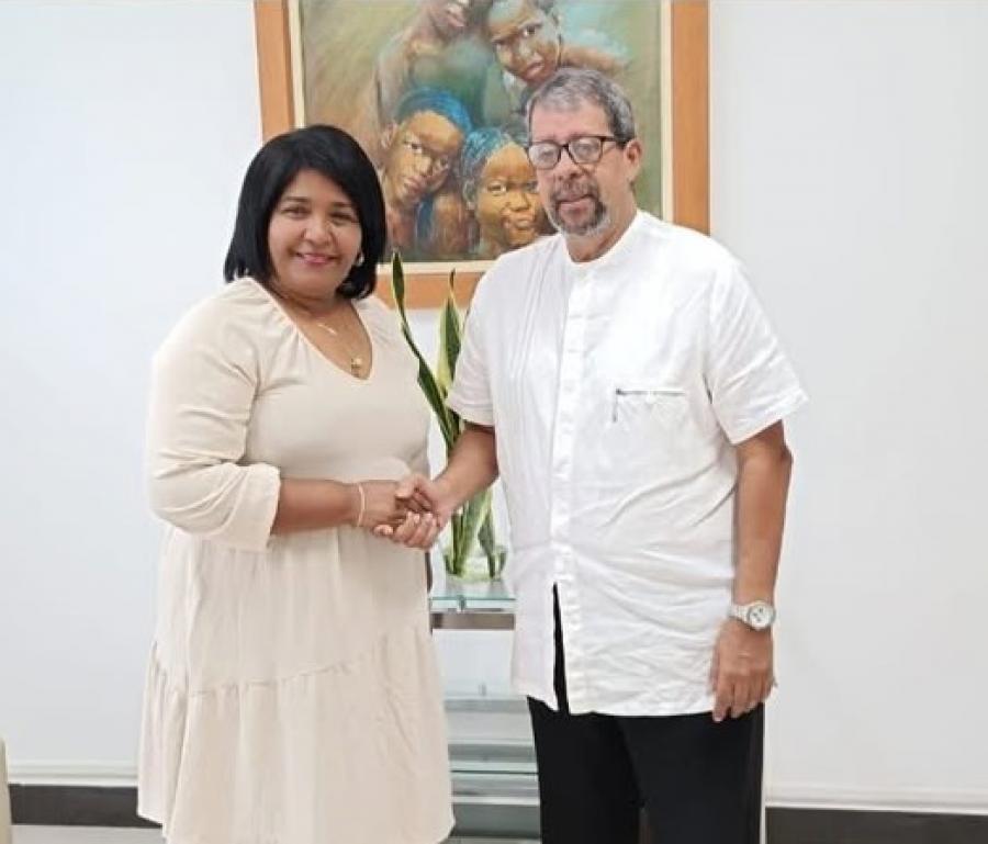 O Ministro da Saúde de Cabo Verde, Dr. Jorge Figuereido, e a Diretora Nacional de Saúde, Dra. Ângela Gomes, receberam a Dra. Aniuska Palacio Noa, Subdiretora de Cooperação Internacional da Unidade Central de Colaboração Médica (UCCM), que esteve acompanhada pelo Dr. Noslando Ramos González, chefe da brigada médica cubana no país. Durante a reunião, foram abordados importantes temas relacionados à assinatura de um acordo de colaboração entre os dois países, bem como o pedido e a chegada de novos recursos humanos cubanos para fortalecer o sistema de saúde cabo-verdiano.