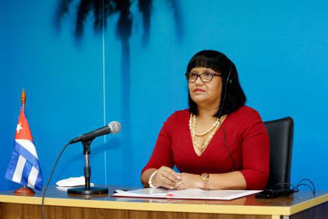 Havana, 24 de fevereiro de 2021.- A Vice-Ministra das Relações Exteriores de Cuba, Anayansi Rodríguez Camejo, participou esta quarta-feira do painel “A Indústria da Saúde a Serviço das Populações”, realizado virtualmente como parte do evento “Estratégico Triângulo: América Latina-Europa-África ”, com o patrocínio do Instituto para a Promoção da América Latina e do Caribe e da Secretaria-Geral Ibero-americana.