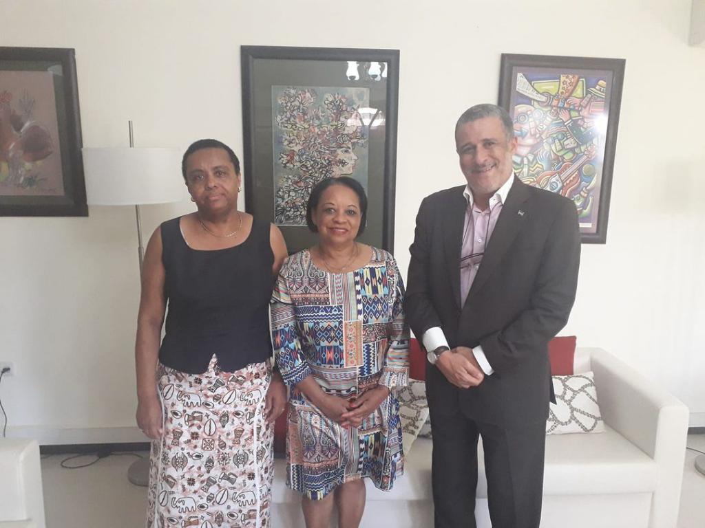 Praia, 23 de abril de 2021 A Embaixadora Rosa Wilson, acompanhada do terceiro secretário César Crespo, teve um agradável e frutífero encontro com o Diretor Nacional de Assuntos Políticos, Econômicos e Culturais do Itamaraty, Embaixador Júlio Morais, e com o Diretor Nacional da o Protocolo Estadual, Edna Barreto.