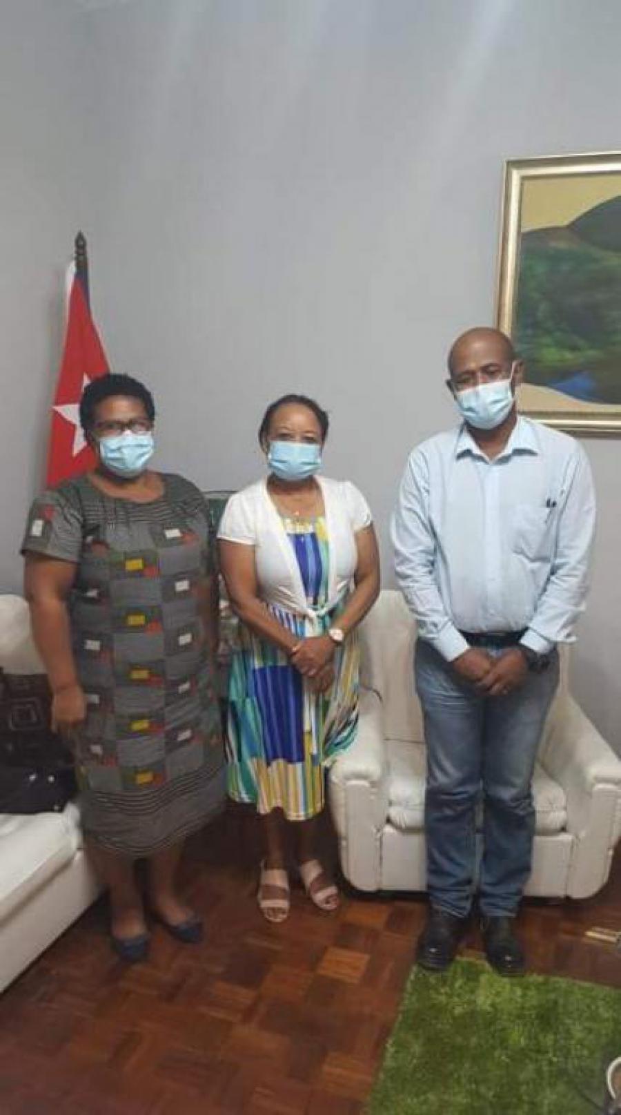 Praia, 6 de novembro de 2020 A Embaixadora Rosa Wilson teve um cordial encontro com a jornalista da Assembleia Nacional, Licenciada Isabel Medina, e o presidente da Associação de Amizade com Cuba (CAMICUBA), Ing. Helder Luis Dias Santos; ambos treinados em Cuba.