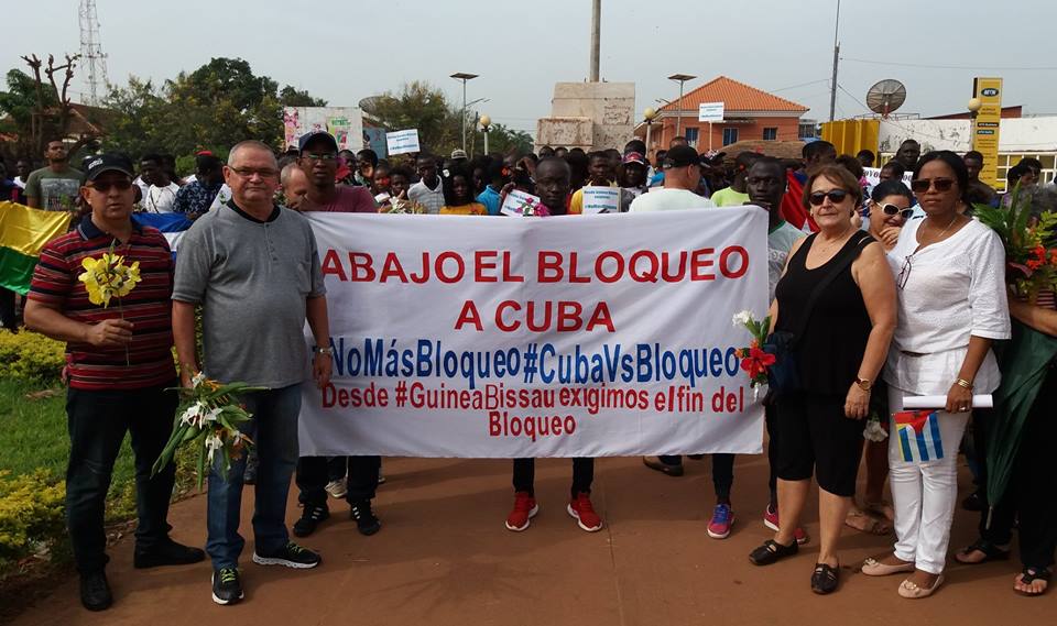 Bissau, 27 de outubro de 2018.- Membros da Brigada Médica, estudantes da Faculdade de Medicina "Raúl Díaz Argüelles", membros da Associação de ex-alunos e amigos de Cuba, juntamente com a Missão Diplomática, realizada na manhã de hoje marcha da Plaza "Che Guevara" no centro da cidade para o porto de Bissau, para homenagear o herói de Yaguajay, Comandante Camilo Cienfuegos Gorriarán e de condenação ao bloqueio genocida imposto pelo governo dos Estados Unidos a Cuba por quase 60 anos.