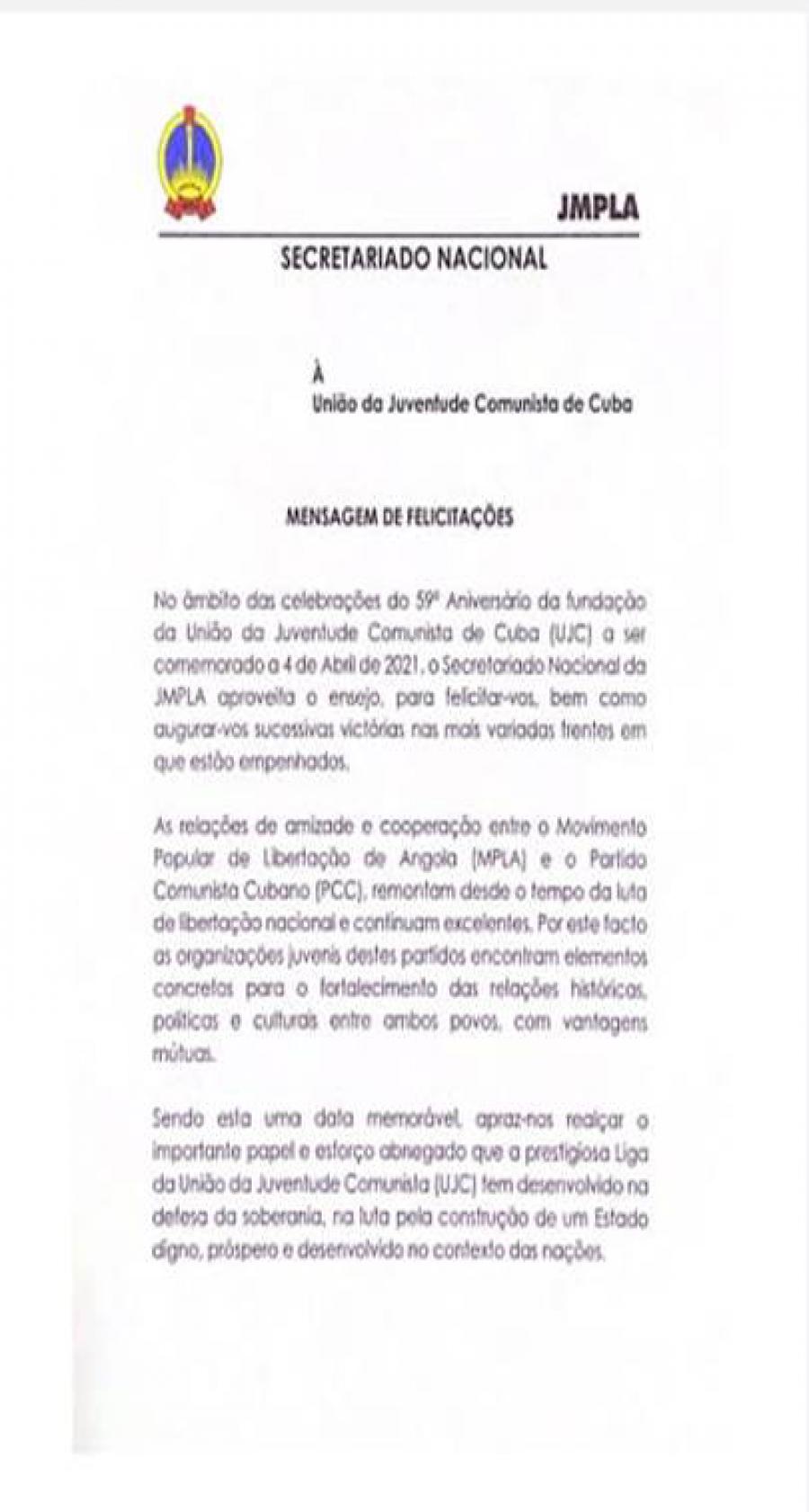 No âmbito das celebrações do 59º Aniversário da fundação da União da Juventude Comunistas de Cuba (UJC), a ser comemorado o 4 de Abril de 2021, o Secretariado Nacional da JMPLA aproveita o ensejo, para o felicitar-vos, bem como augurar-vos sucessivas victórias nas mais variadas frentes em que estão empenhados.