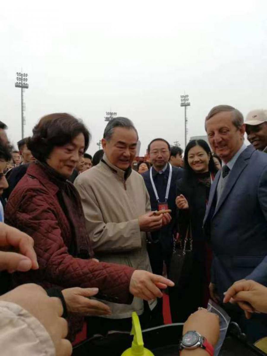 在义卖活动现场,中国外交部部长王毅携夫人一同来到古巴展位前。古巴驻华大使米格尔•安赫尔•拉米雷斯与他们进行了简短的交流,并向中方介绍了古巴文化特色。