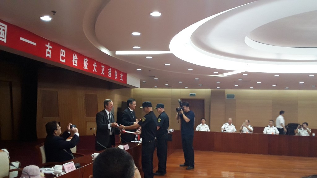 9月13日,北京。米格尔•安赫尔•拉米雷斯•拉莫斯大使出席了中国——古巴检疫犬交接仪式,中古检疫犬合作项目是2016年李克强总理访问古巴期间,中国国家质量监督检验检疫总局与古巴共和国海关总署签订的合作谅解备忘录框架下的执行计划的中的内容。